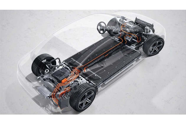 Der EQE hat mit 3,12 Meter einen etwas kürzeren Radstand als der EQS (3,21 Meter). Passen vielleicht nur die 10 Module des kleinen Akkus in den EQE, sind die 12 Module des 108-kWh-Akkus zu lang? Der 91-kWh-Akku ist nach Daten von MBpassion nur 2,12 Meter lang, die Abmessungen des großen Akkus haben wir nicht gefunden; für unser Gefühl könnte in den verbleibenden Meter Radstand noch ein weiteres Doppelmodul passen. Andererseits, auf dem folgenden Bild sieht es nicht so aus, als wäre noch viel Platz: