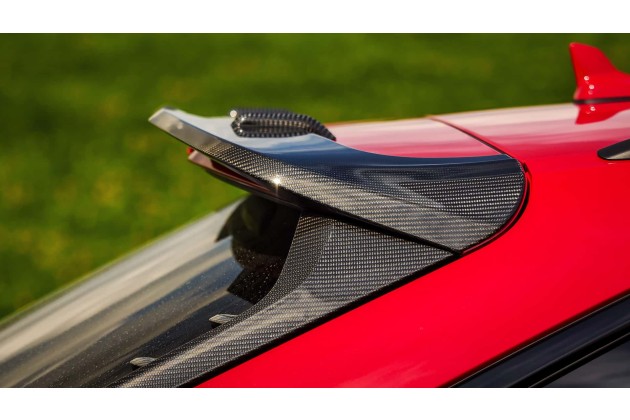 Er sorgt für mehr Wärmeabfuhr des seeehr viel stärkeren V8. Und er hat alle vorgeschriebenen Kopfanpralltests bestanden, was übersetzt wohl bedeutet, dass niemand aufgrund der getunten Haube umkommt. Neu sind zudem der große Dachflügel, die Seitenschweller und schicke rot umstreifte Modell-Logos an Frontspoiler und Heckdiffusor.