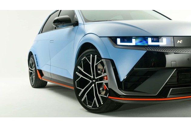 Abseits der Farben spendiert Hyundai einen flügelartigen Heckspoiler, einen Diffusor und neue Stoßfängerdesigns, die die Länge an der Front um 25 und am Heck um 55 Millimeter erhöhen. Durch neu entwickelte Vorder- und Hinterradaufhängungen (dazu später mehr) liegt der Ioniq 5 N natürlich auch tiefer und in den Radkästen sitzen 21-Zoll-Felgen, die die gewaltigen Scheiben der Hochleistungsbremsanlage (400 mm vorne, 360 mm hinten) nur mit Mühe verdecken können. Die Spur ist vorne und hinten 20 Millimeter breiter.
