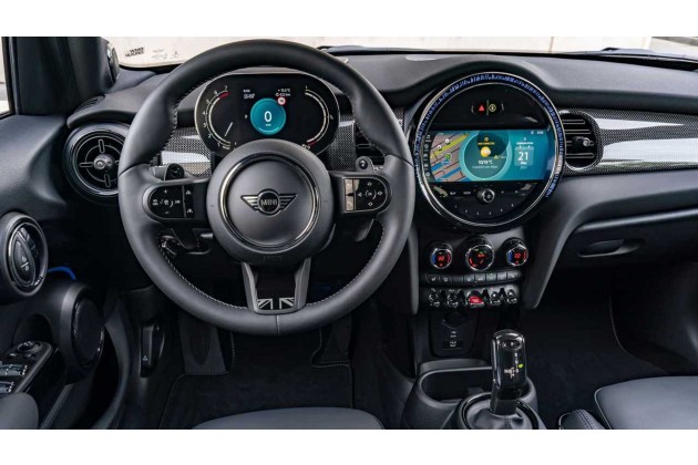 Dabei fällt auf, dass der neue Cooper ein radikal vereinfachtes Armaturenbrett im Vergleich zum bisherigen Modell (siehe Vergleich unten) hat. Es gibt keine Instrumente mehr hinter dem Lenkrad, dafür aber ein Head-up-Display. Der runde Bildschirm in der Mitte enthält den Tachometer und die Infotainmentfunktionen. Unterhalb des Bildschirms befindet sich ein ovales Feld mit den letzten physischen Bedienelementen.