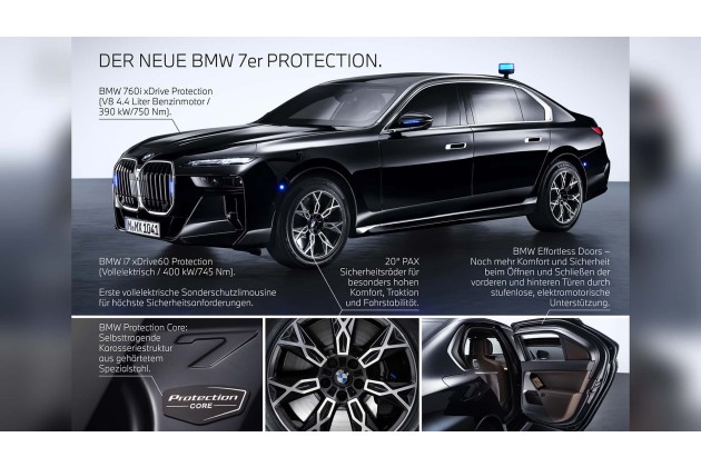 Die Luxuslimousine verfügt dabei über ein innovatives Schutzkonzept, das bereits in der Entwicklung der neuen 7er-Reihe berücksichtigt wurde: der BMW Protection Core. Er besteht aus einer selbsttragenden Karosseriestruktur aus Panzerstahl, kombiniert mit geschützten Türen, Unterboden und Dachpanzerung sowie Sicherheitsverglasung.