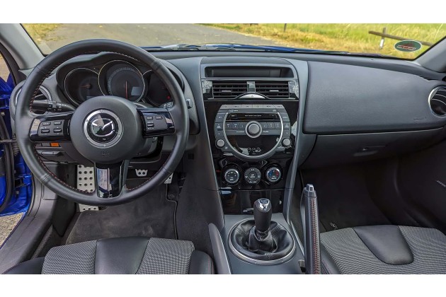 Insgesamt hinterlässt der Innenraum dank verbesserter Verarbeitungs- und Materialqualität einen guten Eindruck. Neu gestaltet hatten die Designer etwa die Mittelkonsole des RX-8 mit unterschiedlichen Bedienelementen in Klavierlack-Optik. Im Blickfeld des Fahrers dominiert weiterhin der Drehzahlmesser.