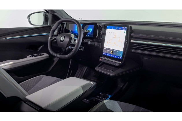 Das Cockpit erinnert mit dem senkrecht eingebauten Touchscreen und dem Instrumentendisplay im Querformat stark an den Elektro-Megane. Was die Materialien angeht, so besteht das Armaturenbrett aus recyceltem Polypropylen und der Jute-ähnlichen Pflanze Kenaf, der Lenkradbezug wird aus PVC auf Rizinusölbasis und Baumwolle hergestellt. Auf Leder verzichtet Renault komplett.