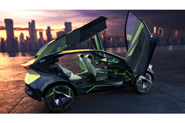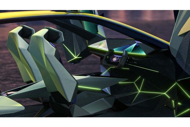 Eingestiegen wird über vier Seitentüren, die sich spektakulär nach oben öffnen - ein klassisches Feature, um auf einer Messe Publikum anzulocken. Außerdem fallen die extrem kantigen Formen ins Auge. Sogar die Felgen, das Armaturenbrett und die Sitze erinnern an Kristalle. Im Cockpit gibt es ein Steuerhorn; anders als viele Studien der letzten Jahre fährt das Concept Car also nicht komplett autonom. Dazu kommen futuristisch aussehende Anzeigen: