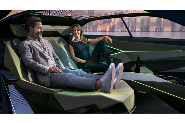 Der Innenraum ist trotz der kantigen Formen wohnlich gestaltet. Die Vordersitze lassen sich zusammenfalten, so dass sie zu einer Beinauflage für die Rücksitze werden. Wenn man das Auto in einem Loft-Apartment oder Bungalow parkt, soll man das Interieur als Raum zur Entspannung nutzen können.