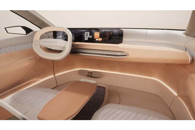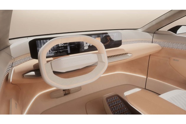 Im pfirsichfarbenen Cockpit prangt ein eckiges Lenkrad in Weiß. Dahinter eröffnet sich eine Monitorlandschaft ähnlich wie beim EV6: zwei Displays im Querformat, dicht nebeneinander. Ansonsten hat Kia offenbar auf Tasten und Knöpfe weitgehend verzichtet. Um das Interieur optisch "clean" zu halten, ist sogar die Klimasteuerung in einer ausziehbaren Konsole versteckt. Außerdem gibt es winzig kleine Lüftungsschlitze, die für eine neuartige Luftzirkulation sorgen sollen - möglicherweise ähnlich wie die Fächel-Funktion im VW ID.7.