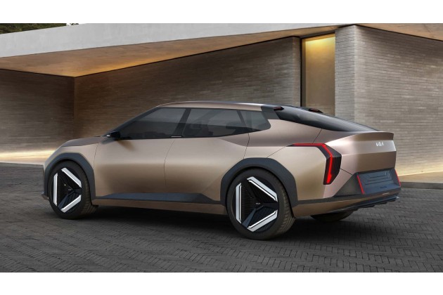 Es handelt sich um eine Limousine mit vier Seitentüren. Die Front erinnert mit den senkrechten Leuchten eher an den Kia EV9 und den EV5 als an den Kia EV6. Die Motorhaube fällt stark nach vorne ab und geht damit fast bruchlos in die Windschutzscheibe über. Obwohl die Haube nicht lang ist, soll es laut Kia einen Frunk darunter geben.