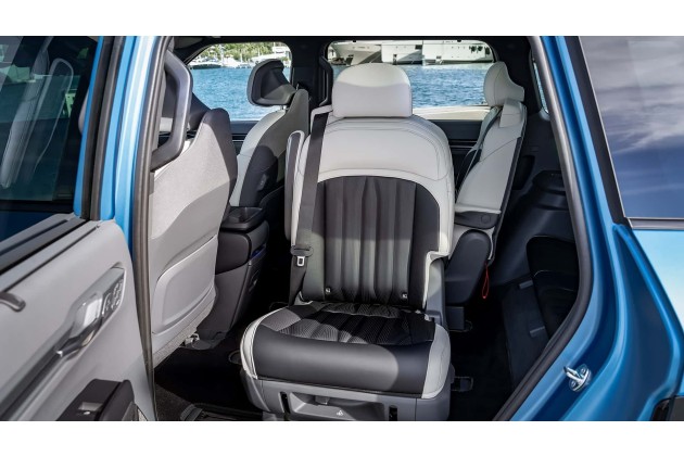 Zwar gibt es den Kia EV9 auch als Siebensitzer, doch besonders interessant sind die Sechssitzer-Varianten (optional für GT-line). Die zwei Einzelsitze in der zweiten Reihe sind wahlweise als Entspannungssitze oder als drehbare Sitze erhältlich (schwenkbar um 90 Grad zur geöffneten Tür hin oder um 180 Grad in Richtung dritter Reihe).