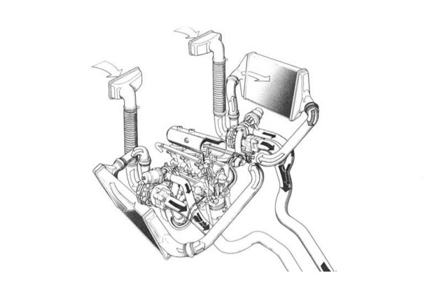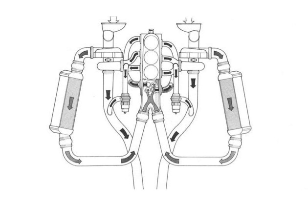 Doch damit nicht genug: Um die beiden Turbos einbauen zu können, wurde der Kopf mit vier Ventilen pro Zylinder nach einem Cross-Flow-Muster umgestaltet. Das bedeutet, dass sowohl die Einlass- als auch die Auslassventile der Zylinder nicht auf der gleichen Seite, sondern abwechselnd angeordnet waren. Dies ermöglichte dem Motor eine homogene Temperatur, eine gleichmäßigere Ausdehnung der Werkstoffe und erlaubte eine höhere Verdichtung und einen höheren Turbodruck und erzeugte günstige Turbulenzen in den Brennkammern.