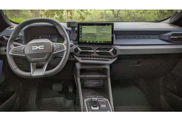 Positiv sind die Ablagen in der Mittelkonsole, der Wählhebel des Automatikgetriebes (nur beim Duster Hybrid) erinnert ein wenig an den VW Golf. Alle anderen Duster werden manuell geschaltet: 100-PS-LPG-Benziner und 130-PS-48V-Mildhybrid. Den Handyhalter auf dem Bild hat bereits die Basisversion des Duster namens "Essential", da sie ab Werk auf den großen Touchscreen verzichtet.