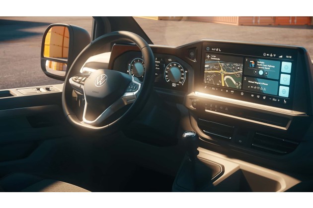Der neue Transporter wird serienmäßige Features wie eine elektronische Parkbremse plus Auto-Hold-Funktion, ein digitales 12-Zoll-Kombinstrument (Digital Cockpit), ein Infotainmentsystem (inklusive DAB+, Apple CarPlay, Android Auto, Online-Services und 13-Zoll-Touchscreen), ein Multifunktionslenkrad, einen Regensensor, den Spurhalteassistenten "Lane Assist", das Notbremssystem "Front Assist" und eine Verkehrszeichenerkennung mit Falschfahrwarnung an Bord haben.