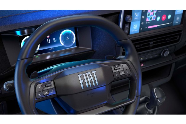 Innen bietet der neue Fiat Scudo nun größere Cupholder und Ablagen, darunter eine zum induktiven Laden von Smartphones. Darüber hinaus ist das neu gestaltete, unten abgeflachte Lenkrad beheizbar.