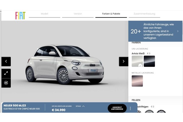 Klickt man aber unter "Neuer Fiat 500 Elektro MJ23" auf "Bearbeiten", dann lässt sich links das Modell "Neuer 500 MJ24" auswählen. Wir klicken auf "Fortfahren" und finden ein Auto in knalligem Gelb (siehe Titelbild) mit 70 kW zum Preis von 29.490 Euro. Hier kann man zwischen sechs verschiedenen Farben wählen. Hier fehlt jedoch die 87-kW-Version.