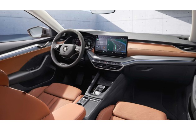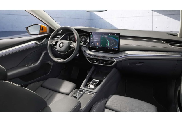Für den Innenraum des aufgewerteten Octavia bietet Skoda fortan neun sogenannte "Design Selections" an, die sich alle durch den verstärkten Einsatz nachhaltiger Materialien auszeichnen. Erstmals kann die Kundschaft für diese Modellreihe ein zentrales Infotainmentdisplay im 13-Zoll-Format ordern. Serienmäßig ist ein zentrales, freistehendes 10-Zoll-Infotainmentdisplay in Kombination mit dem 10 Zoll großen Digital Cockpit. Zu einem späteren Zeitpunkt integriert Skoda einen KI-basierten Chatbot von ChatGPT in die digitale Sprachassistentin Laura.