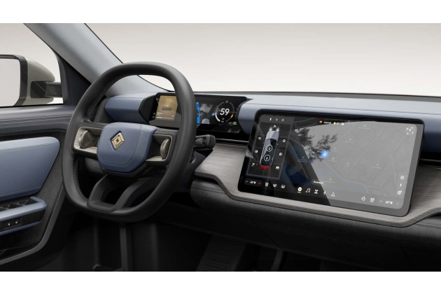 Der Innenraum bietet ein kleineres Instrumentendisplay sowie einen größeren Touchscreen, die aber beide nicht in der gleichen Ebene angeordnet sind. Abgesehen von riesigen Rändelrädern am Lenkrad präsentiert sich das Cockpit puristisch und mit nur wenigen Testen.