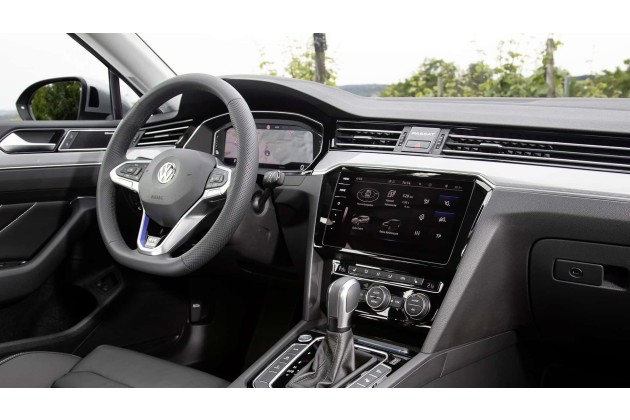 Selbst der Schalthebel auf dem Mitteltunnel ist einem Automatik-Wählhebel auf der rechten Seite der Lenksäule gewichen. Das Lenkrad des neuen Passat Variant hingegen bleibt den physischen Bedienelementen in den Lenkradspeichen wie bisher treu.