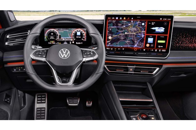 Die Reduzierung der Tasten betrifft die gesamte Mittelkonsole und die Armaturentafel des neuen Tiguan, auf der der große MIB4-Touchscreen mit bis zu 15 Zoll Bildschirmdiagonale zu sehen ist, während die Klimabedienelemente im unteren Teil des Displays untergebracht sind. Auch der Mitteltunnel hat nur noch wenige physische Bedienelemente, die sich in der Praxis auf den Ein-/Aus-Knopf, die elektronische Handbremse und die Lautstärke reduzieren.