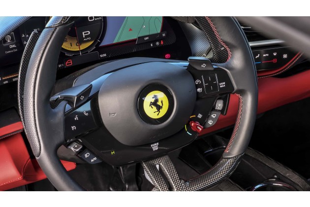 Der Trend zu kapazitiven Tasten, die von einer durchgehenden Kunststoffplatte abgedeckt sind, aber keine haptische Funktion mit Touch-Feedback haben, geht auch an Ferrari nicht vorbei, der Sport- und Luxusmarke schlechthin, die zum Beispiel bei ihrem 296 GTB das Lenkrad mit den unten abgebildeten Bedienelementen anbietet.