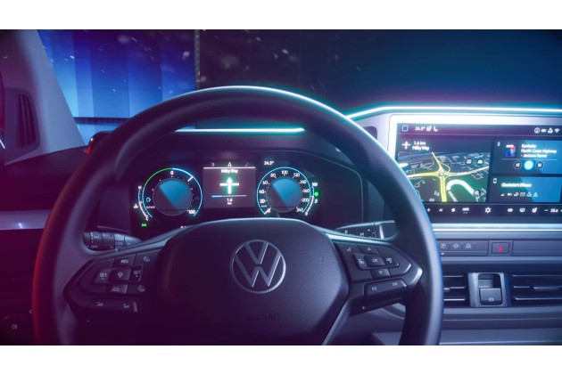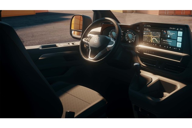 Vertraut sein wird allen Besitzern eines T6.1 die typisch hohe Sitzposition, die breite Türbrüstung und die hohe Position des Wählhebels der neuen Transporter-Generation. So befiindet zumindest Volkswagen Nutzfahrzeuge. Vor dem Fahrer baut sich gut einsehbar auf einer Sichtachse die neue digitale Cockpit-Landschaft auf. Sie besteht aus den frei konfigurierbaren 12-Zoll-Instrumenten ("Digitales Cockpit" mit 30 cm Durchmesser) und dem 13-Zoll-Touchscreen (33 cm Durchmesser) des serienmäßigen Infotainmentsystems (inklusive DAB+ und wireless App Connect mit Apple CarPlay / Android Auto).