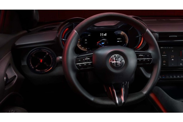 Die digitale Instrumentierung arbeitet mit einem 10,25-Zoll-Monitor. Genau wie bei der Giulia, dem Stelvio und dem Tonale. Der Infotainment-Monitor, ebenfalls 10,25 Zoll groß und auf den Fahrer ausgerichtet, ist stattdessen in eine niedrigere Position zwischen den Lüftungsdüsen und den physischen Tasten für die Klimasteuerung gerückt.