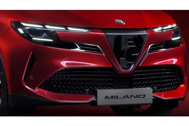 Mit einer Länge von 4,17 Metern, einer Breite von 1,78 Metern und einer Höhe von 1,50 Metern greift der Alfa Romeo Milano einige typische Elemente der Marke wieder auf. Angefangen beim klassischen Front-Dreizack, in dem sich das Visconti Biscione befindet, das die enge Verbindung zur lombardischen Hauptstadt unterstreicht. Das Logo befindet sich auf der Motorhaube, direkt über dem Kühlergrill und ist nicht in Farbe, sondern in Grau und Schwarz gehalten.
