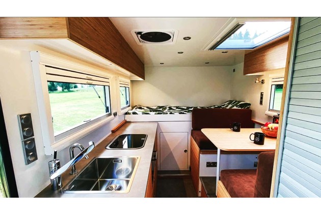 Der dreipunktgelagerte Aufbau, ein Leichtbau-Wohnkoffer, bietet dank detaillierter Planung genug Platz und die passende Ausstattung, um auch abseits der Zivilisation gut schlafen, duschen, kochen, genießen und entspannen zu können. Ein großer Tank für Frisch- und Brauchwasser ist an Bord, ebenso Solarpanels für die autarke Stromerzeugung, und ein elektrisch oder gasbetriebenes Kochfeld nach Wahl. Der komplette Aufbau wird vollständig in Deutschland gefertigt.