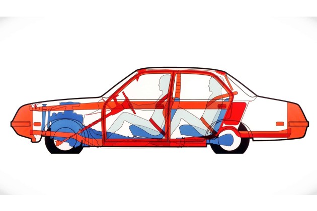 Ganz schön fortschrittlich für die 1970er-Jahre. Aber Moment, es geht noch weiter: Schaumgefüllte Längsträger an der Front lassen bei Aufprallgeschwindigkeiten von mehr als acht km/h eine kontrollierte Verformung zu. Darunter verhindert die Schaumstruktur gar eine bleibende Deformation. Eine Vorstufe zum selbstreparierenden Stoßfänger war geboren.
