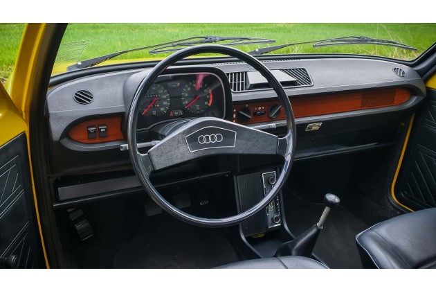 Sehen wir uns das riadgelbe Geburtstagskind näher an: 3,52 Meter ist der Audi 50 lang, nur 1,56 Meter breit und 1,34 Meter hoch. Doch 2,33 Meter Radstand und der quer eingebaute Motor sorgen für ein relativ gutes Platzangebot, selbst für großgewachsene Menschen. Dabei helfen auch die großen Fenster und schmalen Dachpfosten. Eine Einparkhilfe braucht man hier definitiv nicht.