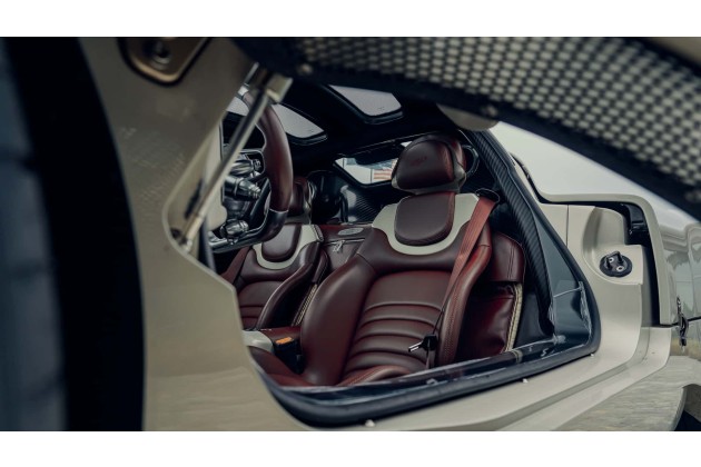Dieses Hypercar ist zwar nach dem Begriff der Utopie benannt, aber ein Wirklichkeit gewordener Traum. Die Fahrertür schwingt auf und öffnet sich wie eine Einladung mit Goldprägung. Ein Fuß steckt tief im Fußraum, der durch das Karbon-Monocoque des Utopia gebildet wird. Man lässt sich in den Sitz fallen, erst langsam, dann auf einmal, als würde man sich verlieben.