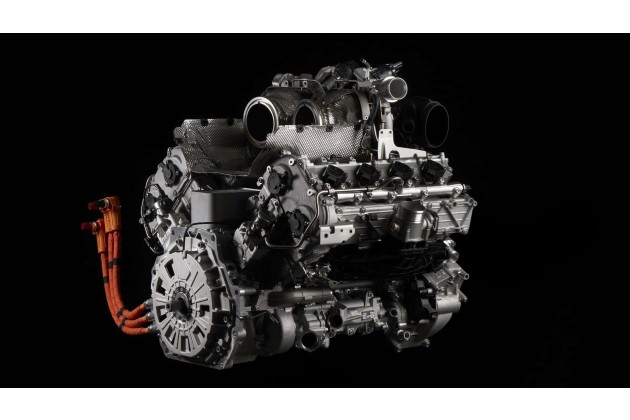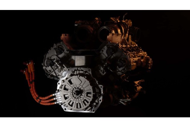 Die drei 150 PS (110 kW) starken, ölgekühlten Axial-Elektromotoren, die den Benzinmotor unterstützen, wurden so integriert, dass der gesamte Antriebsstrang so kompakt wie möglich ist. Der hintere Elektromotor sitzt zwischen dem V8 (fest mit der Kurbelwelle verbunden) und dem 8-Gang-Doppelkupplungsgetriebe.
