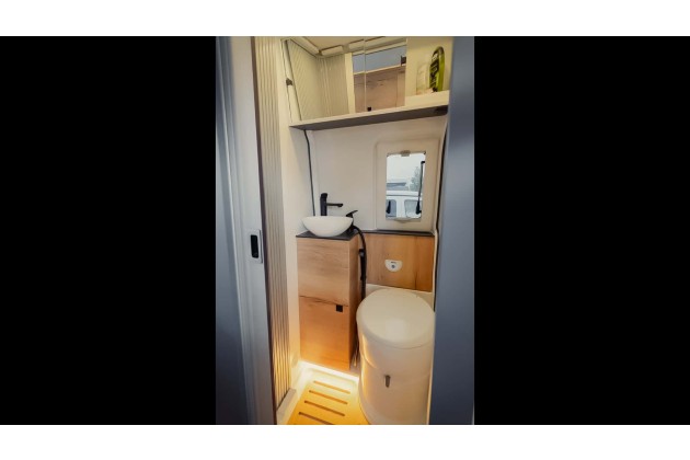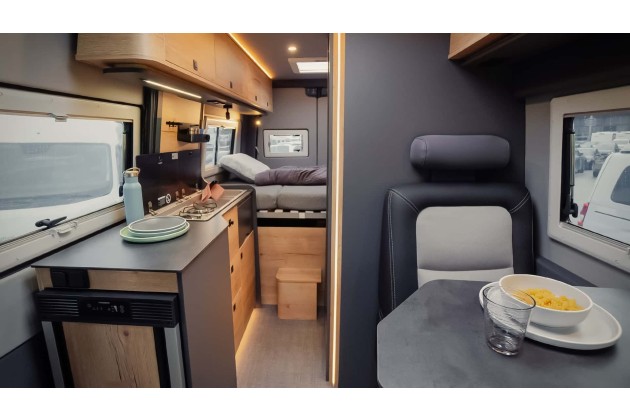 Hinter den Fahrersitzen befindet sich eine variable Sitzecke mit einem freischwebenden, verstell- und herausnehmbaren Tisch. Die Küchenzeile ist mit einem 70-Liter-Kompressorkühlschrank ausgestattet, wobei die Auszüge und Oberschrankklappen über eine Softclose-Funktion verfügen. Und natürlich gibt es auch ein Bad mit Toilette, wobei deren Besonderheit die Lamellenschiebetür ist, die den oft nervenden Duschvorhang überflüssig macht.