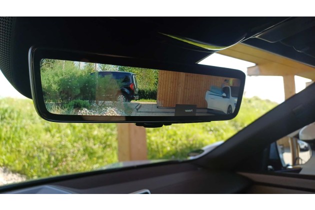 Der kamerabasierte Innenspiegel vom Spezialisten Gentex ist nicht schlecht: Die Kamera lässt sich in Blickrichtung und Helligkeit einstellen, zudem kann man auf einen konventionellen Spiegel umschalten, wenn man die Kinder im Fond im Blick behalten will. Ein perfekter Ersatz für einen normalen Spiegel und eine Heckscheibe ist das Ding aber nicht. So spiegelt er bei sonnigem Wetter und die Augen von Älteren (wie mir und meinem mitfahrenden Kollegen Rudi) haben Probleme, sich an die Nahumgebung zu adaptieren, wenn man vom Blick nach vorne auf den Spiegel wechselt.
