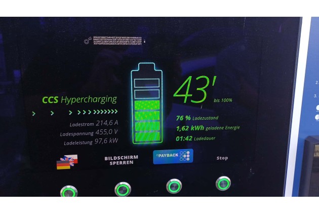 Aufgeladen wird mit bis zu 200 kW. Das ist so ziemlich das Maximum für ein 400-Volt- Auto, denn der CCS2-Anschluss ist auf 500 Ampere limitiert, und 400 Volt mal 500 Ampere sind ...? Richtig, 200.000 Watt oder 200 kW. Ein kurzer Ladeversuch ergab rund 100 kW - nicht schlecht für den Ladestand, denn der lag nur wenig unter 80%. Beim Erreichen dieser Schwelle fiel die Ladeleistung abrupt auf 80 kW.