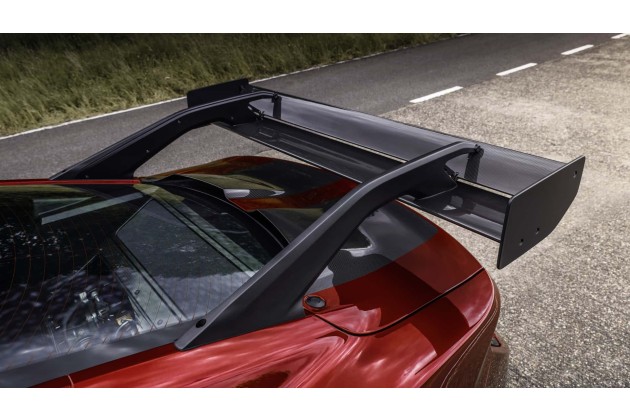 Dank des Achtgang-Doppelkupplungsgetriebes im hinteren Teil des Fahrzeugs ergibt sich ein nahezu perfektes Gewichtsverhältnis von 50:50. Antriebswellen aus Kohlefaser überträgt die Kraft des V8-Motors auf die Räder, wo die semiaktive hintere Schubstangenaufhängung, die durch die hintere Trennwand sichtbar ist, die Lage unter Kontrolle hält. Die vordere Aufhängung besteht aus einem Layout mit kurzen und langen Lenkern.