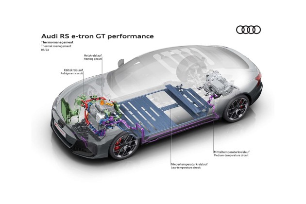 Generell sollen nun auch bei niedrigen Temperaturen hohe Ladeleistungen erreicht werden. Das liegt am optimierten Thermomanagement für die Batterie. Die Ingenieure erwähnen eine verbesserte Kühlplatte und optimierte Pumpen. Da ich weiß, dass der e-tron GT gleich vier Kühl- und Heizkreisläufe hat, womit unzählige verschiedene Modi möglich werden, verzichte ich darauf, mir das näher erklären zu lassen ...