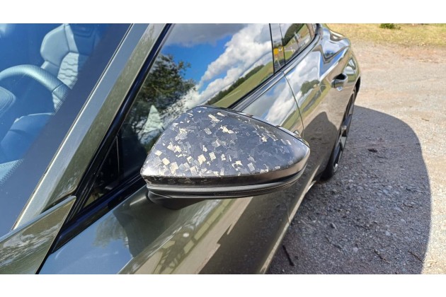 Mein RS e-tron GT Performance hatte eine olivgrüne Lackierung, die mich an das VW ID.3 Facelift erinnert. Ehrlich gesagt, mir wäre fast jede Farbe lieber gewesen als dieses Bedfordgrün Metallic, das mich ans Militär erinnert, zumal bei meinem Testwagen auch noch Carbonelemente in Tarnoptik hinzukamen: L-förmige Teile am Frontspoiler, die Außenspiegel-Kappen und die Zierleisten an den Schwellern. Zusammen bilden diese das Optikpaket Carbon Camouflage matt.