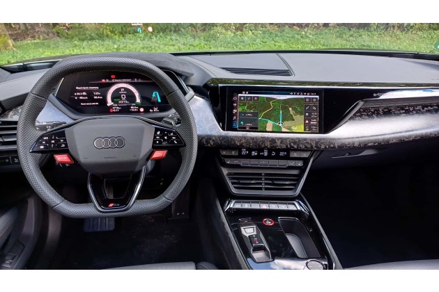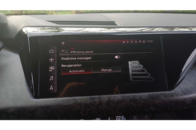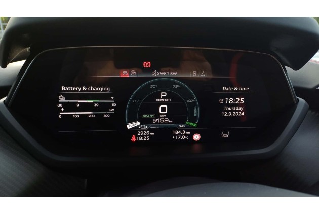 Was die Rekuperation angeht, so hat Audi die Energierückgewinnung sowohl beim Bremsen als auch beim Gaspedal-Loslassen erhöht. Bei der Brems-Rekuperation sind nun bis zu 400 kW möglich. Mein Testauto war auf automatische Rekuperation eingestellt. Dabei wählt der Wagen die Stärke der Schubrekuperation automatisch: Sie wird erhöht, wenn der Vordermann bremst, ein Tempolimit oder ein Stopp-Schild folgt usw. Über die Wippen am Lenkrad kann man die Rekuperationsstärke beeinflussen, aber nur vorübergehend.