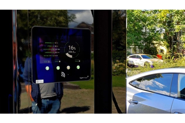 Bei einem Demo-Ladeversuch bei kühlem Wetter und ohne Batterie-Vorkonditionierung wurden immerhin 294 kW erreicht; das obige Bild zeigt das Display der Ladesäule.