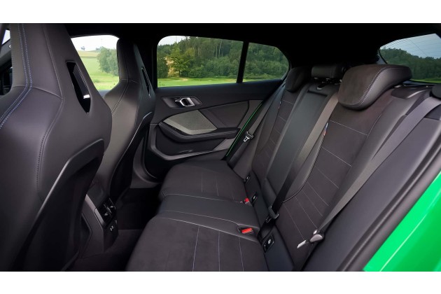 Das neue M-Sportlenkrad - im M135 mit roter Mittelmarkierung - ist weich gepolstert und liegt sehr gut in der Hand. Der sehr dicke Kranz ist ungewohnt und bei kleinen Händen schon fast zu wuchtig. Auf der Rücksitzbank herrschen akzeptable Platzverhältnisse, solange der Fahrer nicht größer als 1,80 Meter ist. Sonst wird es eng für die Knie. Ein Golf zum Beispiel bietet hier deutlich mehr.