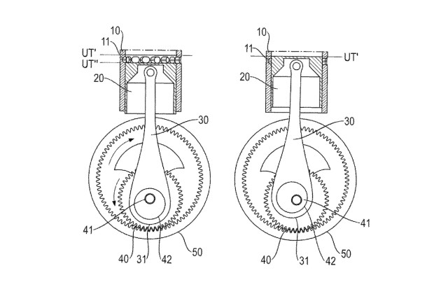 Das Porsche-Patent zeigt dazu eine Kurbelwelle, die sich auf einem Ring mit zwei konzentrischen Kreisen - einem Ring - dreht. Dadurch ändert sich der Drehpunkt der Kurbelwelle, so dass der Hub des Kolbens (unterer Totpunkt) bei den zusätzlichen Hüben etwas abgesenkt wird. Das wiederum verändert die Verdichtung, da der Kolben nicht mehr so weit oben (oberer Totpunkt) im Zylinder sitzt. Und das bedeutet auch, dass dieser Motor zwei obere und untere Totpunkte hat.
