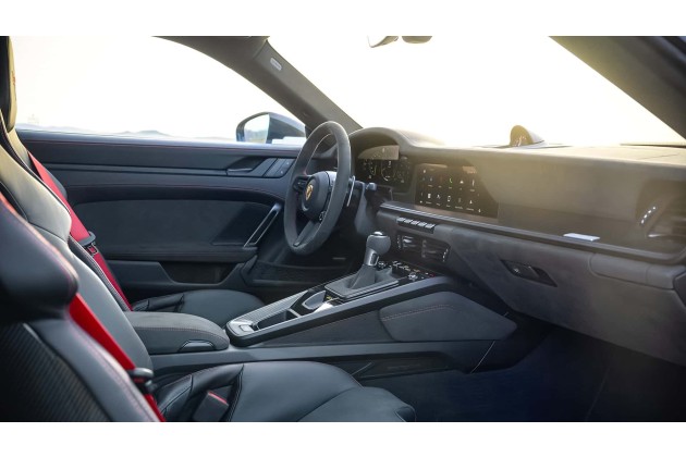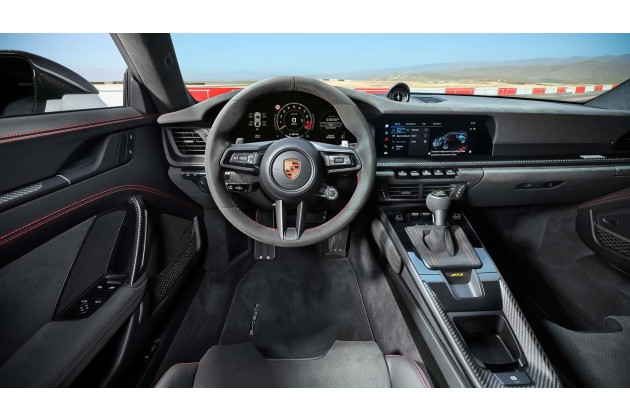 Der Rest des Cockpits orientiert sich am jüngst gelifteten 911 Carrera, außer dass es der neue Startknopf zum Glück nicht in den GT3 geschafft hat. Der sogenannte Track-Screen reduziert die digitalen Anzeigen links und rechts des Drehzahlmessers auf Daten zu Reifen, Öl, Wasser und Kraftstoff. Außerdem zeigt er einen Schaltblitz an. Die Anzeige des Drehzahlmessers kann auf Wunsch so gedreht werden, dass sich 9.000er-Marke auf der 12-Uhr-Markierung befindet.