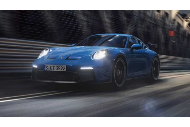 Kontur des Frontdiffusors, eine geänderte Form der Buglippe und modifizierte Finnen am Unterboden. Die neu gestalteten Matrix LED-Hauptscheinwerfer kriegen Sie optional mit weißem Akzentring. Die neuen Leuchten bündeln alle Lichtfunktionen des 911 und machen die Zusatzleuchten in der Frontschürze daher überflüssig. Am Heck sind Diffusor, Lufteinlässe und Heckdeckel neu gestaltet. Der Heckflügel des 911 GT3 erhält neue, angewinkelte Sideplates.