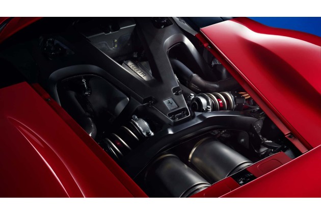 Zum ersten Mal erhält ein Ferrari-Straßenfahrzeug einen 48-Volt-Elektromotor, der zwischen Turbine und Kompressor eingesetzt wurde. Dieser ermöglicht es den zwei großen Turboladern, die Leistung ohne Verzögerung bereitzustellen. Ebenfalls eine Innovation aus der Formel 1 - dort bekannt als MGU-H (Motor-Generator-Unit-Heat).