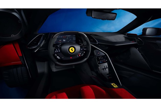 Die Anleihen aus der Formel 1 durchziehen auch den Innenraum des Ferrari F80. Das Cockpit des "1+1" wurde von einem Einsitzer inspiriert und um den Fahrer herum konzipiert. Der Beifahrer sitzt weiter hinten.