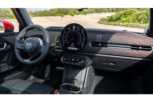 Im Innenraum kriegen wir - wie wir es kennen bei John Cooper Works-Varianten - jede Menge Schwarz und Rot. Die spezifischen Sportsitze sind aus Kunstleder, haben rote Nähte und ein mehrfarbiges Strickmaterial im Schulterbereich. Noch mehr Strick finden Sie auf dem Armaturenbrett. Dazu kommen ein eigenes Sportlenkrad und ein Harman Kardon-Soundsystem.