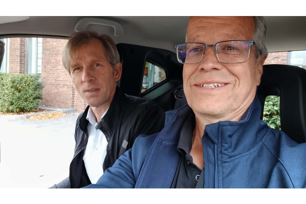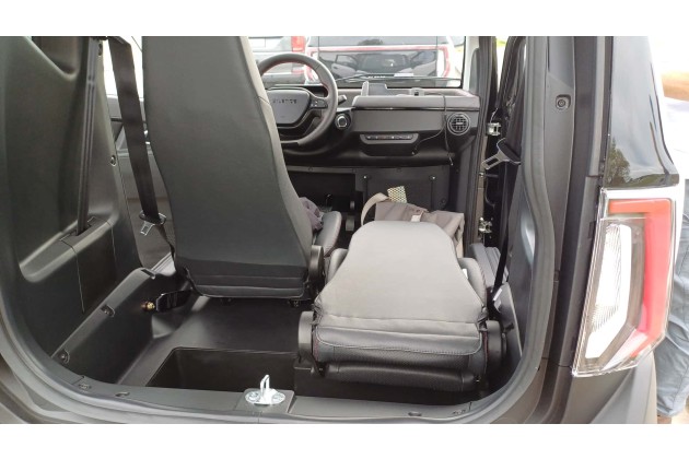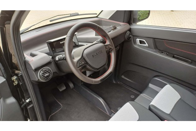 Ins Innere kommt man wegen der üppigen Höhe von 1,57 Metern sehr leicht. Drinnen gibt es zwei spartanisch aussehende Sitze, die wegen der geringen Breite das Wägelchens versetzt eingebaut sind: Die Person am Steuer sitzt zwei Handbreit weiter vorne als die Person auf dem Beifahrersitz. Mit einem Kollegen probierte ich die doppelte Besetzung aus: Im Stand kein Problem, aber wenn ich als Steuermann das Lenkrad in der Kurve nach rechts drehen würde, stieße ich dem Kollegen wohl den Ellenbogen gegen das Brustbein.