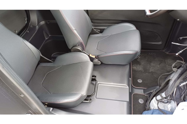Die Sitze lassen sich längs verschieben, der Beifahrer kann sich also auch weiter nach hinten bugsieren. Zumindest beim Fahrersitz lässt sich auch die Lehnenneigung einstellen. Das ist auch die einzige Methode, die richtige Sitzposition zu finden, denn weder das Lenkrad noch die Sitzhöhe lässt sich justieren. Zum Lenken finde ich rasch eine gute Position, aber ich sitze sehr hoch im Fahrzeug und gucke auf den obersten Teil der Frontscheibe. Wer länger ist als 1,76 m wie ich, sollte probesitzen.