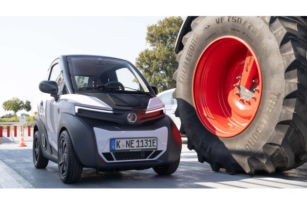 Der vom spanischen Hersteller auch Nanocar genannte Winzling ist wie erwähnt nur 2,28 Meter lang, aber stattliche 1,57 Meter hoch. Damit wirkt er neben einem Opel Astra wie ein Riese, neben dem Hinterrad eines Traktors aber wie ein Zwerg.