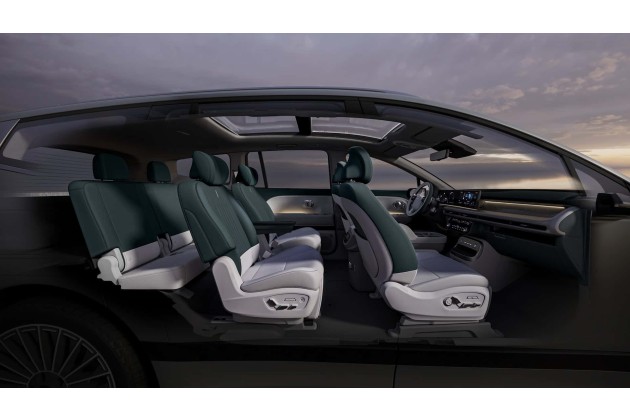 Wie den EV9 gibt es auch den Ioniq 9 mit sechs oder sieben Sitzplätzen in drei Sitzreihen. Wie bei Kia können die Sitze der zweiten Reihe beim Sechssitzer können um 180 Grad gedreht werden, damit man sich im Fond gegenübersitzen kann. Über der Kabine gibt es ein Glasdach, möglicherweise ein Schiebedach.