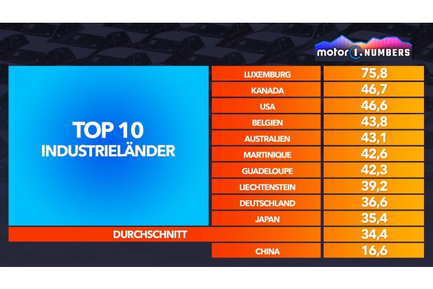 An zweiter und dritter Stelle liegen zwei Länder, in denen das Auto ein wesentlicher Bestandteil der täglichen Mobilität ist: Kanada und die Vereinigten Staaten. Ersteres mit 46,7 und letzteres mit 46,6 Neuwagen pro 1.000 Einwohner. Schließlich ist das Auto in diesen beiden nordamerikanischen Ländern seit jeher ein Synonym für Freiheit, mehr als in jeder anderen Region der Welt. In den Top Ten befinden sich interessanterweise auch zwei Karibik-Inseln, Deutschland liegt lediglich auf Platz 10, erreicht innereuropäisch immerhin den vierten Rang.